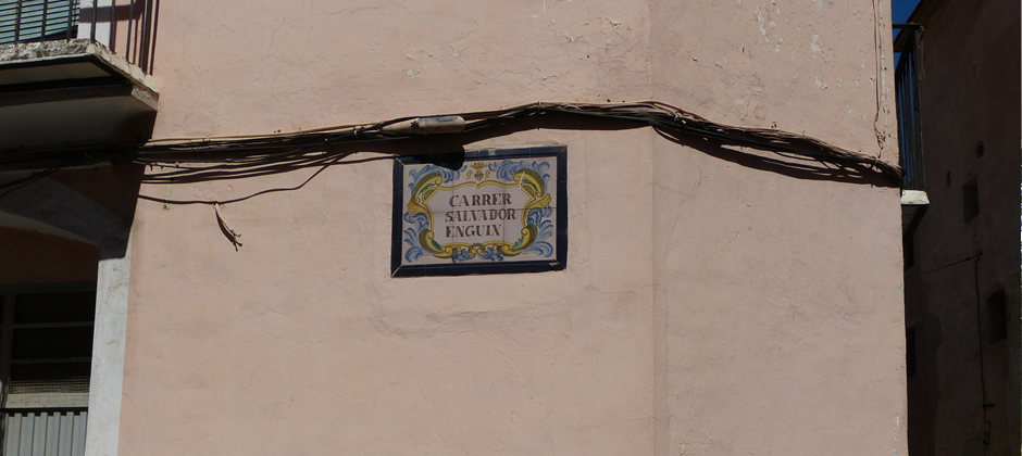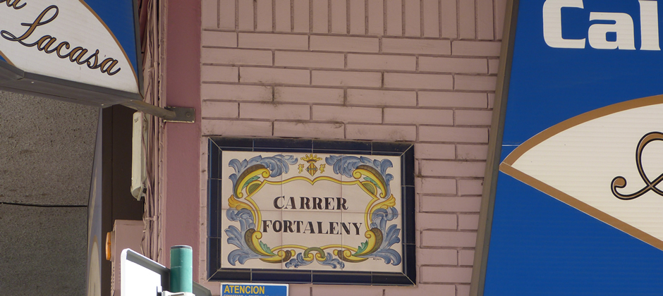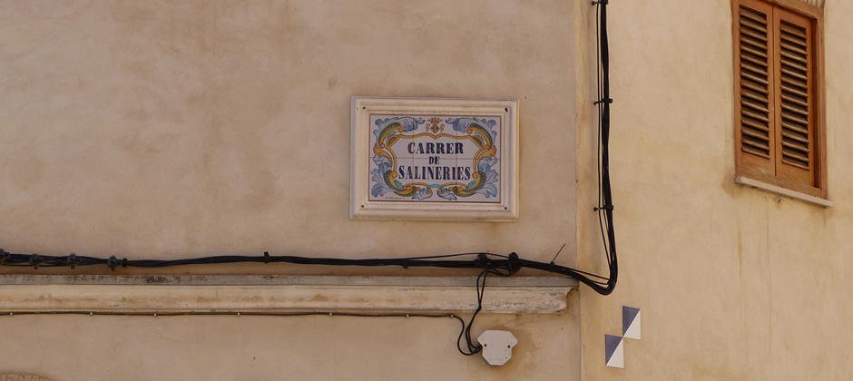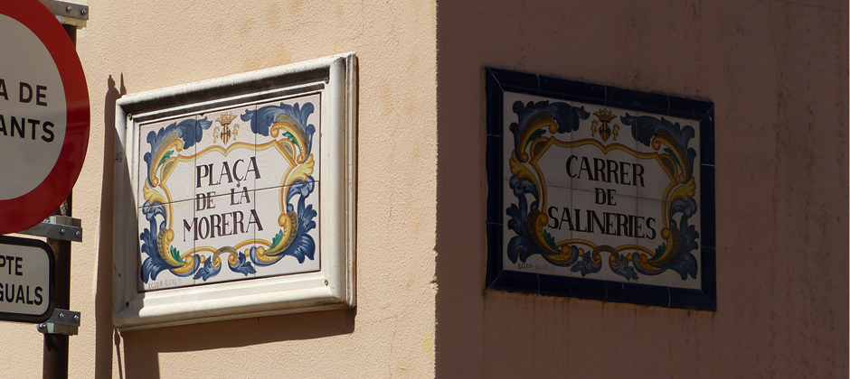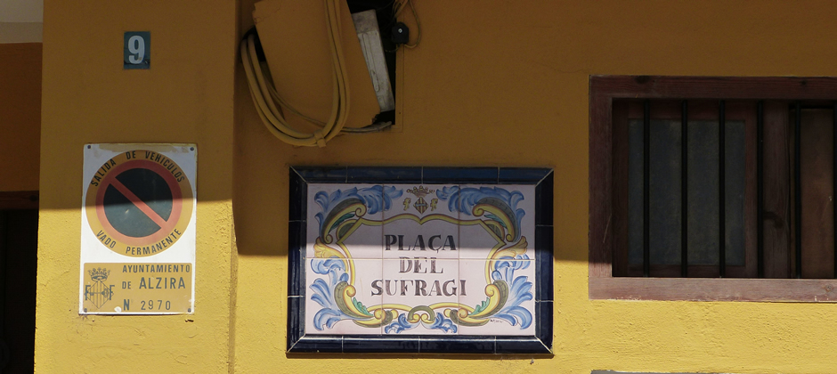 En la fotografía se observa una esquina en la parte izquierda placa de calle en azulejos de 20 x 20 montada sobre marco de piedra artificial con la leyenda plaza de la morera, en la foto de la derecha placa de calle con la leyenda calle de las salidas, enmarcada con moldura antigua de 5 x 20 en color azul. La diferencia entre una placa y la otra está en el marco y en su montaje en la vía pública, la placa de la izquierda montada sobre piedra artificial tiene un montaje muy rápido y la placa de calle de la derecha está colocada de forma tradicional y cantada con cemento a la pared, ambas placas están pintadas a mano y están colocadas en la localidad de Alzira.